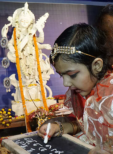 The tradition of Haate Khori is unique to Bengali families. Haate Khori marks the beginning of a child’s journey of learning. With the blessings of Maa Saraswati, children start their education.